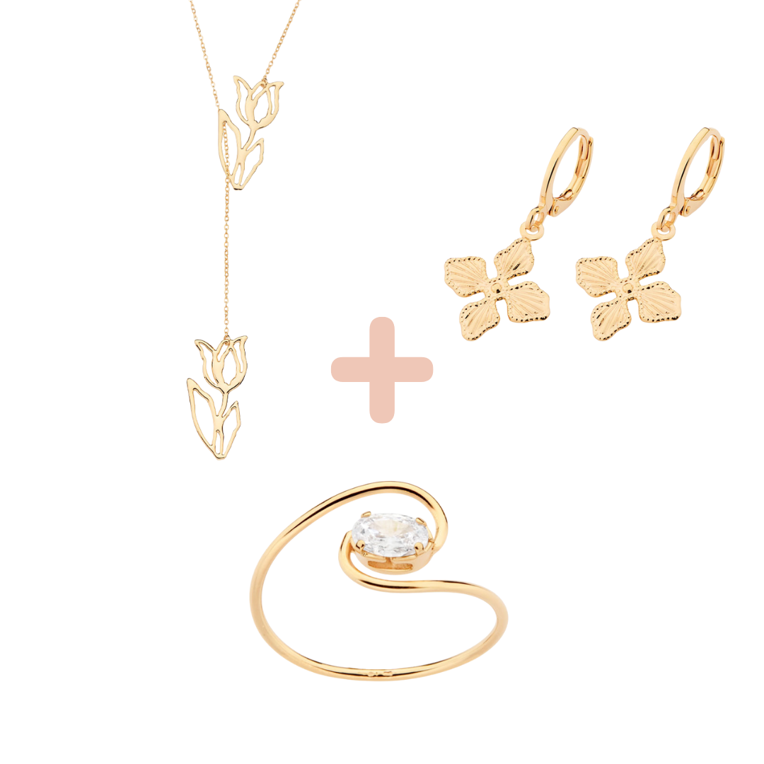 O Kit Florena Ă© formado por 3 joias sofisticadas, banhadas a ouro 18K, escolhidas para mulheres que querem brilhar em grande estilo. Um conjunto elegante e poderoso.
