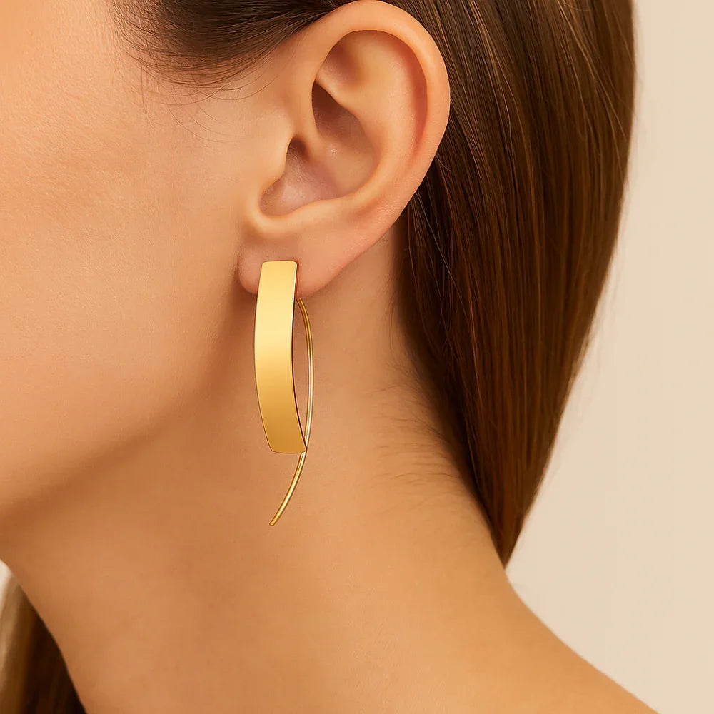 Design sofisticado e contemporâneo com o Brinco Meia Argola com Chapa Lisa Retangular e Pino Longo, uma peça exclusiva da coleção Giovanna Antonelli. Essa joia premium é banhada a ouro 18K, combinando elegância e modernidade para realçar seu estilo com delicadeza.