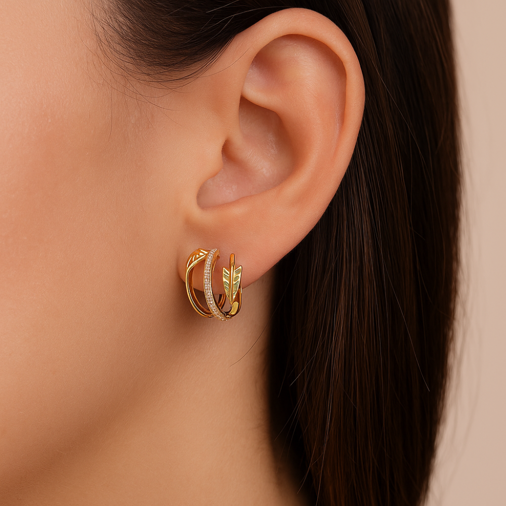 Adquira já o Brinco Meia Argola Triplo com Flecha, perfeito para iluminar seus momentos com charme inesquecível.