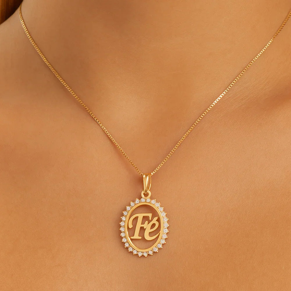 Elegância e espiritualidade em um único detalhe. O Pingente Oval Cravejado com 25 Zircônias e Inscrição Fé é uma joia exclusiva, banhada a ouro 18K, perfeita para quem busca um acessório sofisticado que simboliza esperança e proteção.