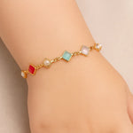 Encante a pequena com a Pulseira infantil de pedras coloridas com pérolas sintéticas intercaladas, uma joia delicada e colorida perfeita para crianças. Com 14 cm de comprimento, essa pulseira é feita para proporcionar conforto e estilo desde cedo, banhada a ouro 18K para maior brilho e durabilidade.
